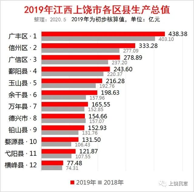 从数据分析,广丰区438.38亿排名全市第一,信州区333.28亿排名全市第二,横峰县77.48亿排名全市末尾。