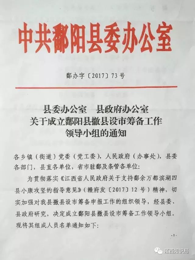 2017年6月,为贯彻落实《江西省人民政府关于支持鄱余万都滨湖四县小康攻坚的指导意见》(赣府发[2017]12号)精神,鄱阳县成立了撤县设市筹备工作领导小组,正式启动了撤县设市工作。
