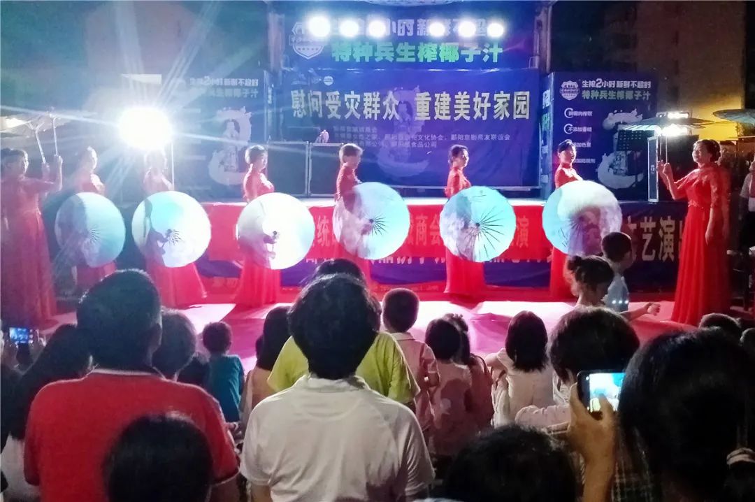 7月30日,华灯初放,鄱阳县湖城商会、鄱阳楼食品有限公司组织文艺志愿者在县委常委、统战部部长吕小珍带领下来到秋实学校受灾群众安置点开展慰问演出,给大家送上心灵的慰藉。县政协经科委主任黄育兰、副主任王鑫,政协常委、湖城商会会长程水龙以及湖城商会部分经科委界别委员一起参加慰问演出活动。
