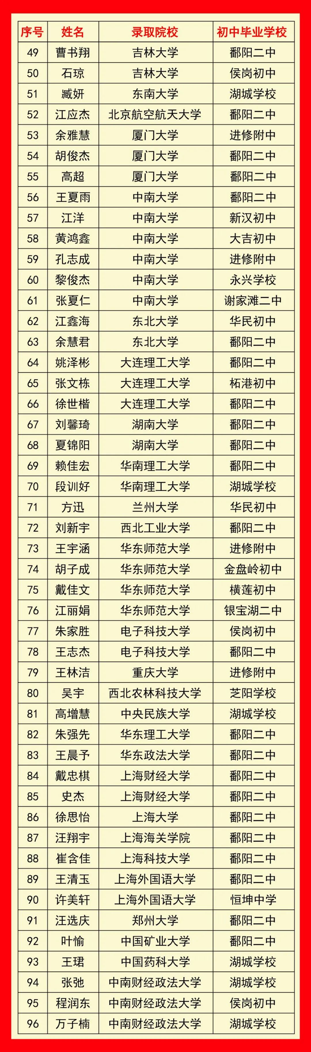 喜四海扬波,凤翥龙骧,华表笙歌蒸酒劲;扬千帆竞秀,云蒸霞蔚,梦圆时曲美诗香!2020年高考,百年名校鄱阳中学喜报频传:上北京大学录取线4人,陈思思、曹语杨荣录北大,其中曹语杨同学是今年上饶市高考“强基计划”北京大学录取第一人;600分以上148人,一本、本科上线均创历史新高。截至8月23日,我校已有100多人录取双一流院校,以下为部分录取榜单。