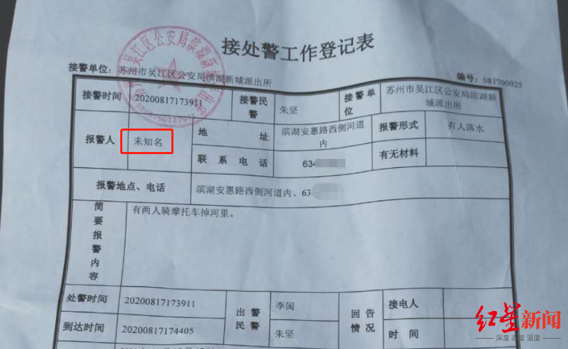 吴江区滨湖新城派出所接处警工作登记表显示,事发后的报警人“未知名”。