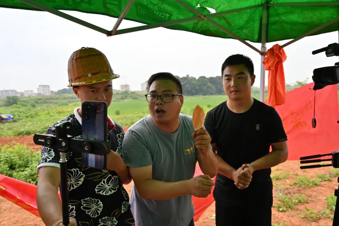 9月4日上午, “深挖少年薯味,助力家乡脱贫”鄱阳湖红薯直播活动在乐丰镇丰源村举行,鄱阳本地 “网红”在红薯地里为扶贫红薯站台直播。