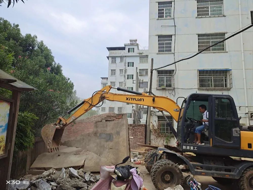 拆除现场,2台挖掘机同时作业,对违建的砖混附属房、铁皮棚、围墙等进行一一拆除,4辆渣土运输车正在清运建筑垃圾。鄱阳镇社区城管中队长高峰带领10多名社区城管,在现场维护秩序。