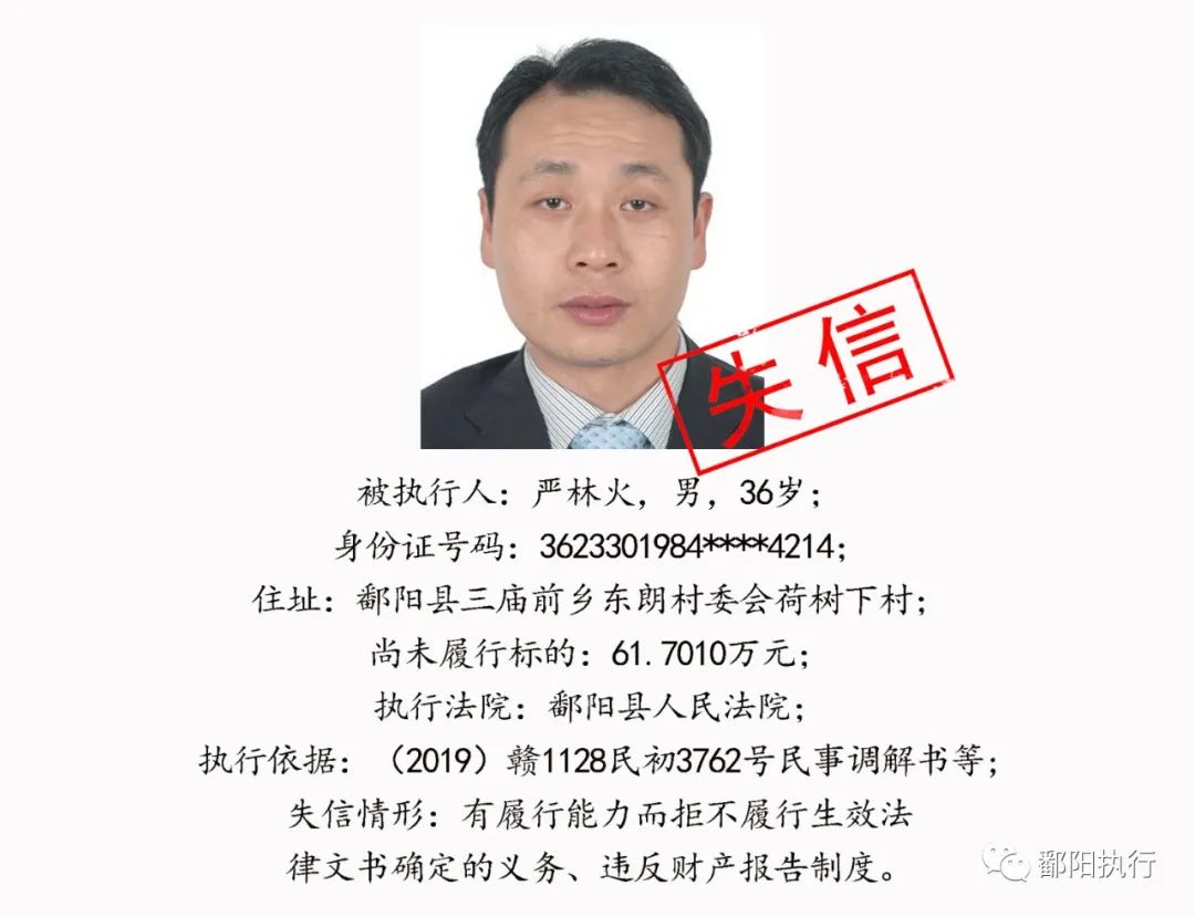 鄱阳县人民法院根据《中华人民共和国民事诉讼法》第二百五十五条之规定,黎兵春、史方艳等21名失信被执行人,拒不履行生效法律文书确定的义务,现将其具体信息公布如下,欢迎广大市民予以监督、举报。