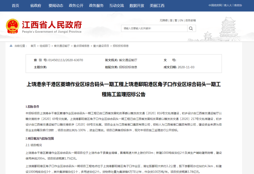 11月3月,江西省人民政府发布上饶港余干港区菱塘作业区综合码头一期工程上饶港鄱阳港区角子口作业区综合码头一期工程施工监理招标公告