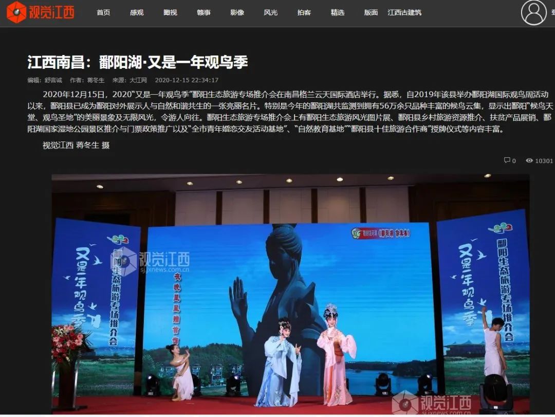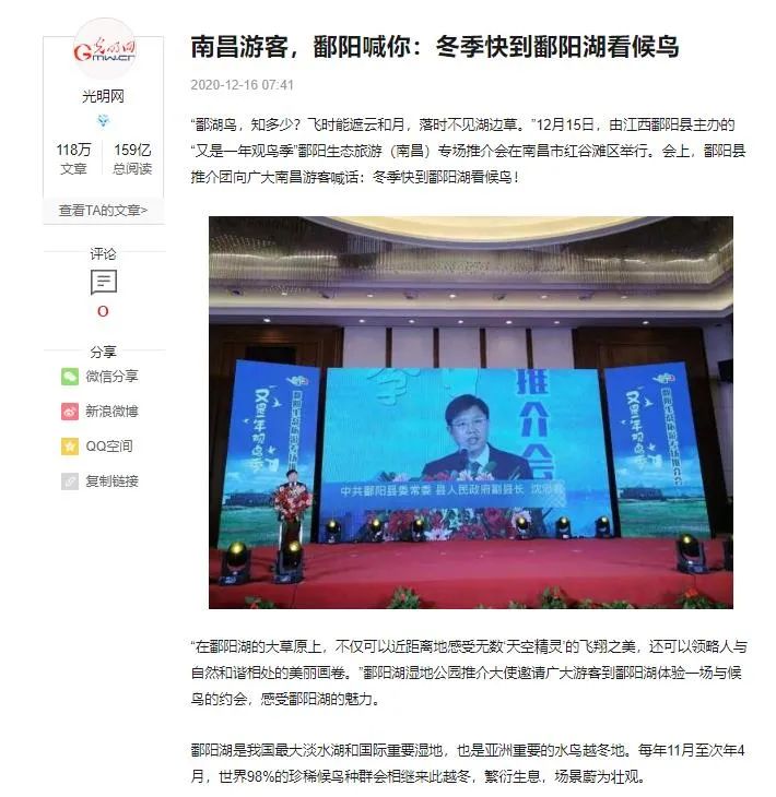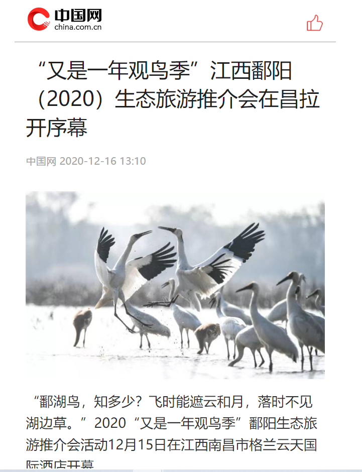 这几天,鄱阳县打响鄱阳湖旅游世界品牌,推介会也受到了人民网、新华社、环球网、今日头条、凤凰网、新浪网等全国各大媒体的关注报道。来鄱阳观候鸟,在江西迅速走红,鄱阳湖国家湿地公园景区成为网红打卡点,引爆媒体界!