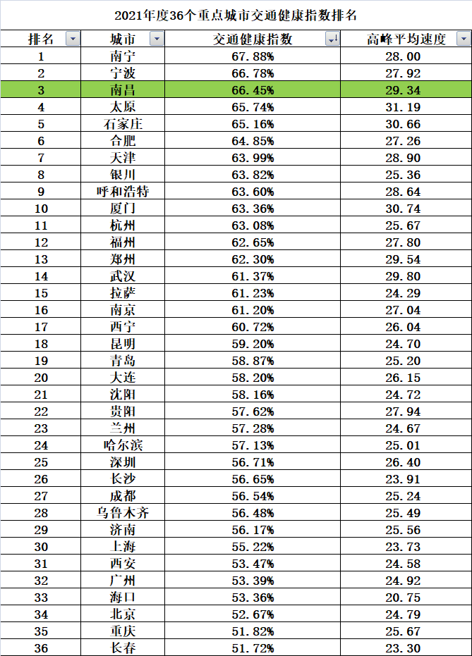日前,高德地图联合“国家信息中心大数据发展部”“清华大学交通研究所”“同济大学智能交通研究中心”等机构共同联合发布了《2021年中国主要城市交通分析研究报告》。根据高德统计数据,南昌市2021年度交通健康指数在全国36个重点城市(直辖市、省会城市、副省级城市)中位列第三名、在中部六省省会城市(南昌、太原、合肥、郑州、武汉、长沙)中位列第一名。
